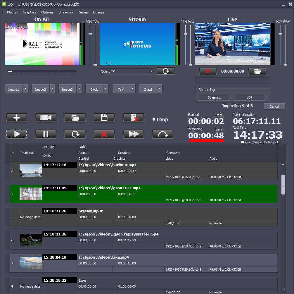 GoPlayout es un playout de video low cost, profesional, automatizado, capaz de reproducir prácticamente cualquier archivo de video. También reproduce streams, imágenes estáticas y archivos de audio. Graba la señal en vivo en alta calidad en formato MP4.